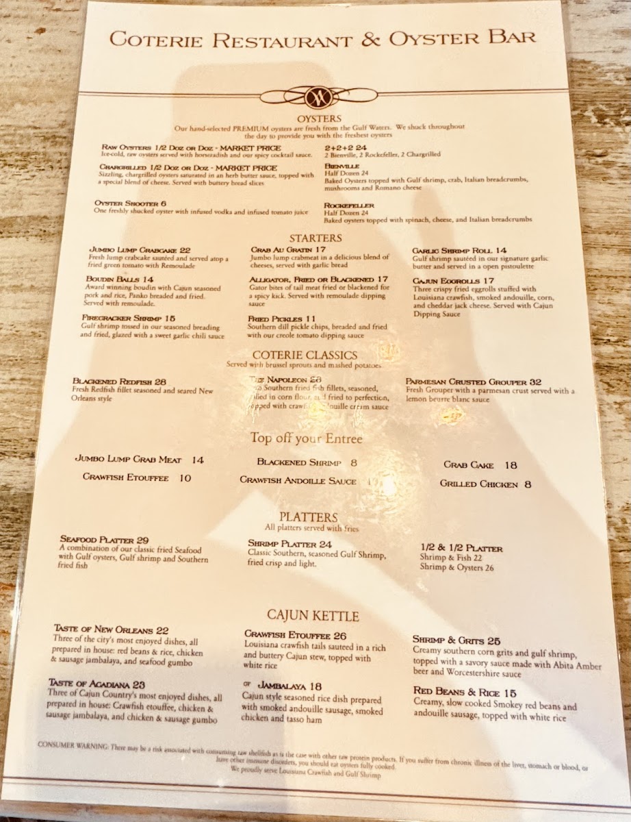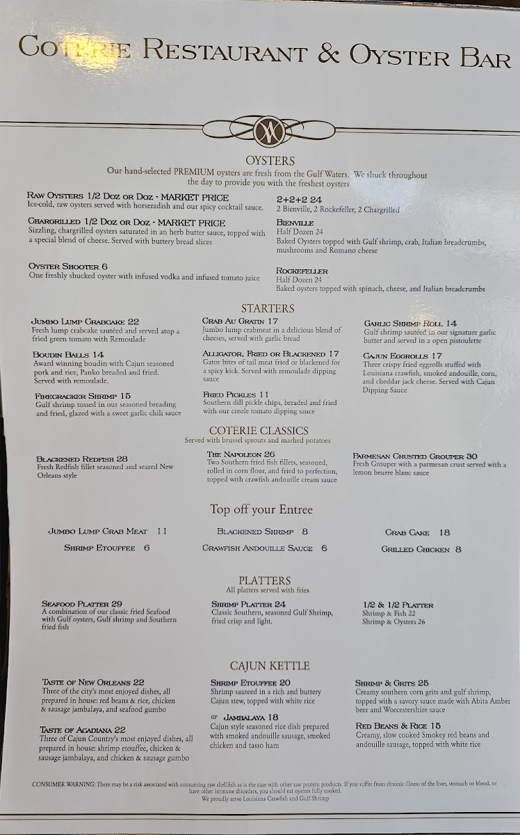 Coterie Restaurant & Oyster Bar offers a vibrant escape into the heart of Louisiana cuisine. Renowned for its diverse menu, patrons rave about the standout dishes like chargrilled oysters, gumbo, and the tantalizing Gator Po Boy. The atmosphere buzzes with warmth and friendly service, as exemplified by attentive staff like Caty and Erica, who enhance the dining experience with their hospitality. From perfectly seasoned shrimp étouffée to the delightful boudin eggrolls, every bite captures the essence of New Orleans. With a welcoming bar area and happy hour specials, Coterie is an ideal spot for gatherings and unforgettable culinary adventures.
